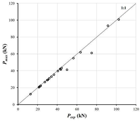 where k is set to 1.2. The coefficient of determination (R2) between the predicted results from Equations (36) and (37) and the experimental data is 0.980 (Figure 6), with a coefficient of variation (CoV) of Pexp/Pmax equal to 0.058, which indicates excellent predictive accuracy of the proposed bond model. Table 3 shows the results of the calculations of for FRP anchor/concrete joints.