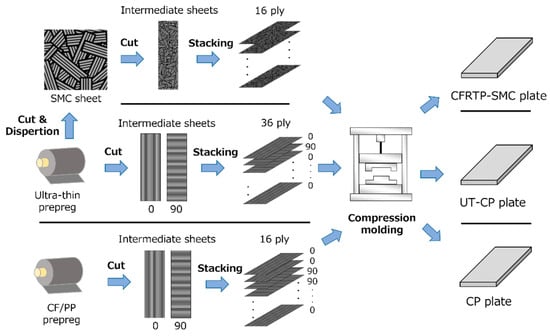 Compared with a conventional continuous fiber composite, a cross-ply material system with a stacking sequence [0/90]9s was applied. The same ultra-thin prepreg sheet composed of CF/PA6 was used. The ultra-thin cross-ply (UT-CP) plates were also manufactured through a heat-and-cool compression molding cycle, as illustrated in Figure 2.