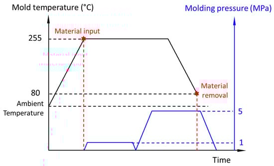 The CFRTP-SMC, also known as ultra-thin chopped carbon fiber tape reinforced thermoplastics, is considered a feasible material for the mass-production automotive industry on account of its outstanding performance on mechanical properties and formability [24]. The CFRTP-SMC is composed of carbon fiber (TR 50S, Mitsubishi Rayon Co., Ltd., Tokyo, Japan) and Polyamide-6 (PA6, Diamiron TM C, Mitsubishi Plastics, Inc., Osaka, Japan) with a volume fraction of 55%. The tape has a size of 18 mm in length, 5 mm in width, and an ultra-thin thickness of 50 µm. Compared to the conventional prepregs with an average thickness of 100 to 150 µm, CFRTP-SMC is superior in suppressing microcracking and delamination damage both in static and dynamic tests [25]. SMC sheets, as illustrated in Figure 1, were fabricated via a wet-dispersion manufacturing process [26,27]; after that, the SMC sheets were trimmed to intermediate sheets with a dimension of 245 mm × 120 mm to fit the mold size. Intermediate sheets were adequately dried with a vacuum dryer (DRV320DA, ADVANTEC, Tokyo, Japan) at 90 °C for 12 h before plate fabrication, and final CFRTP-SMC plates were manufactured with the stacked intermediate sheets through heat-and-cool compression molding; the molding cycle is presented in Figure 2. The materials were input when the mold temperature reached 255 °C, then were pressed under 1 MPa to preheat the material; afterward, molding pressure increased to 5 MPa, and then the temperature started to cool down to 80 °C for plate removal [28].