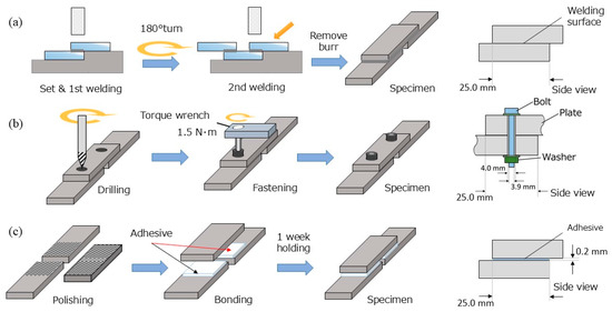 Adhesive joining has the merits of joining different materials, excellent airtightness, and sealing properties. To apply the adhesive joining method, pretreatment of the surface grinding with sandpaper No. 400# was carefully conducted. After that, the adhesive of Scotch-Weld DP-8010 (3M Japan Limited) was evenly applied on the bonding surface; a primer is not necessary since the adhesive is polyolefin resin. To ensure the adhesive was completely cured, pressure through the thickness direction was applied for one week. The adhesive layers of finished specimens have an average thickness of 0.2 mm, as illustrated in Figure 3c.