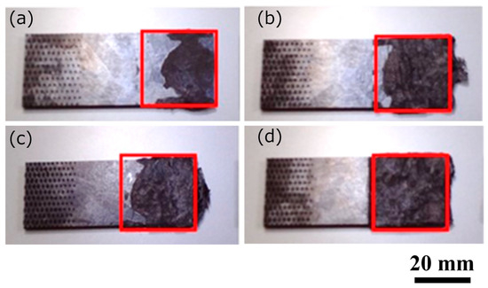 The welding surface (red boxes) of CFRTP-SMC specimens with different vibration times: (a) 1.0 s, (b) 1.2 s, (c) 1.5 s, (d) 2.0 s.