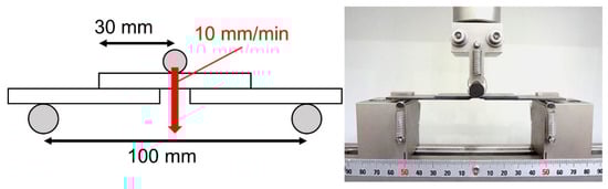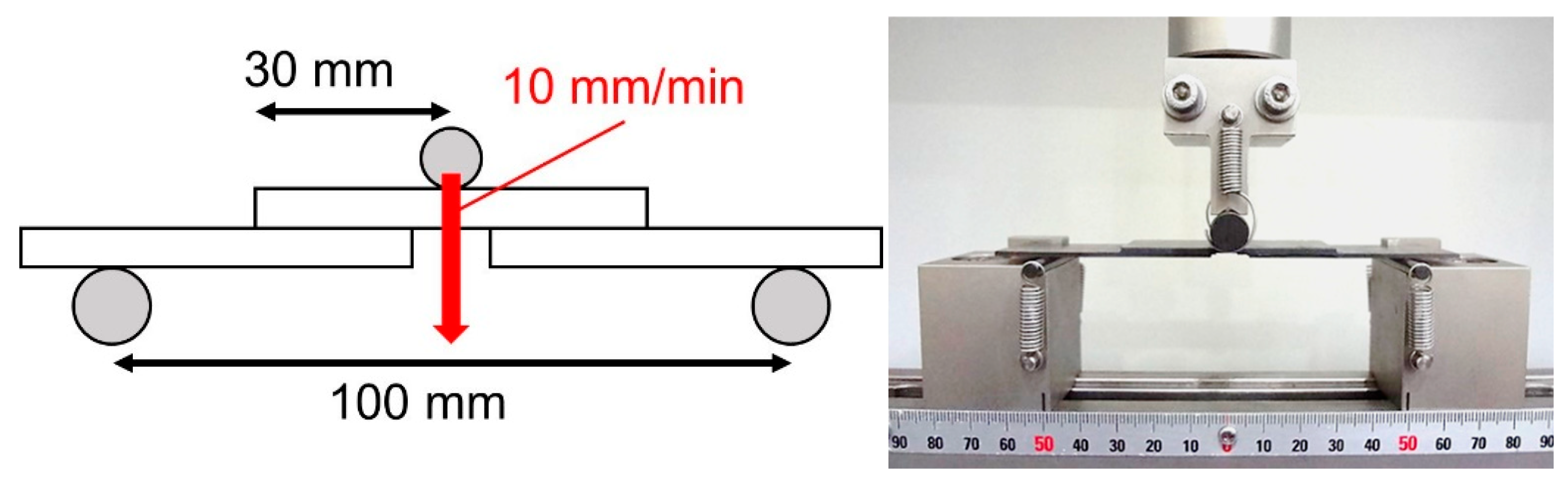 Schematics of the three-point bending setup are illustrated in Figure 5; the tests were conducted by a table-top universal testing machine (AUTOGRAPH AG-X 5kN, Shimadzu Co., Ltd., Kyoto, Japan), the support span distance is 100 mm, and the displacement speed was equal to 10 mm/min for all specimens during the loading process. Loads and displacements were sampled by the load cell in real-time every 0.1 s until the fracture occurred on the specimens.