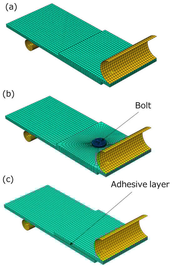 FE modeling. (a) Ultrasonic welding, (b) bolted joint, (c) adhesive joining.