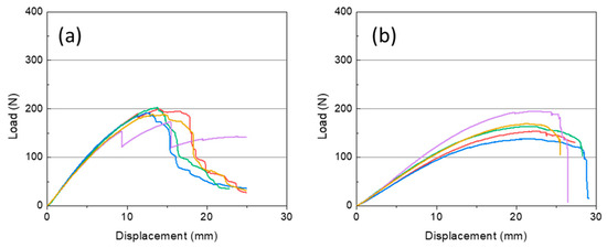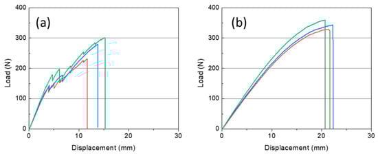 Load-displacement curves of CFRTP-SMC specimens. (a) USW and (b) BJ.