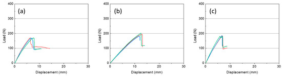 In this study, three-point bending tests with different material systems and jointing methods were conducted; during the loading processes, the load-displacement curves were recorded (Figure 7, Figure 8 and Figure 9), and the specimens were allowed to deform until they reached ultimate failure.