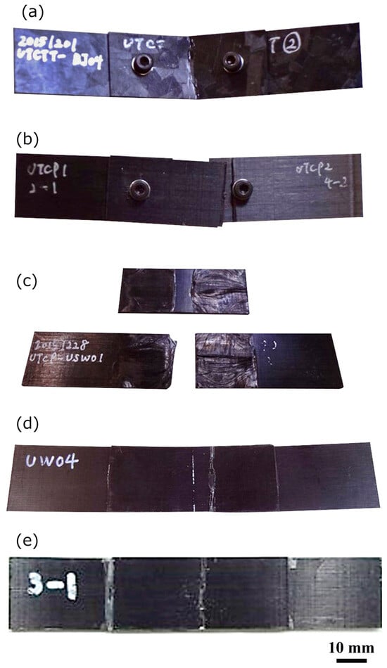 On the other hand, the load-displacement curves of UT-CP and CP material systems are shown in Figure 8 and Figure 9, the failure that occurred in UT-CP and CP material systems are totally shown as brittle fracture regardless of joining method, and the load-displacement curves are shown as a sudden vertical drop when the ultimate load was reached. All the specimens experienced very small individual differences except for USW UT-CP, which is due to the failure mode of USW UT-CP being detachment of the welding part, as shown in Figure 10b, the individual differences of joining parts resulted in the scatter variance of USW UT-CP structures.