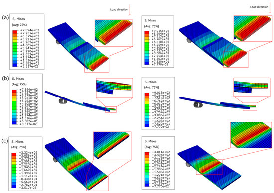 The stress distribution contour of USW and AJ composite structures at maximum bending load is shown in Figure 11. The simulation results indicate that the stress distributions of USW and AJ composite structures under bending load are similar to each other; the upper plate sustains severe compressive stress at the upper surface layer and tensile stress at the lower surface. Moreover, the edge of the joining surface between the upper and lower plate shows intense stress concentration as illustrated in Figure 11c, especially for the USW structures. Three main failure modes were observed for USW and CP composite: (a) compressive failure under the indenter, (b) the detachment of the welding surface, and (c) compressive failure at the welding edge. Among these three kinds of failure modes, material failure under compressive failure under indenter was preferred since the material properties were not limited by the jointing properties. The FEM results accurately predicted the hazardous areas, which are consistent with failure modes that occurred in the experimental tests. Stress concentration in joining edge of USW structures is more severe than AJ structures as FEM results indicated, which accounted for the failure at welding edge and welding surface in USW specimens satisfactorily.