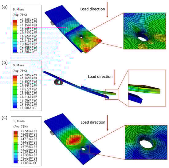 Stress contour of bolted joint (BJ) cross-ply (CP) composite from upper plate (a), side (b), and lower plate (c) view.