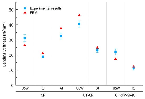 The rigidity of various material systems with different jointing methods was compared, as shown in Figure 13. The AJ structure showed a slightly higher rigidity than the USW structure in the CP specimens due to the slight increase in structure thickness on account of the adhesive layer. On the other hand, the USW structure still shows the advantage of high-speed welding and self-adhesion compared to AJ and BJ because the materials were melted and bonded by themselves. The rigidity of the BJ structure is obviously lower than that of USW structures in all the materials because of the separation of the upper and lower plates, as described in the previous section. Besides, comparing with FEM and experimental results, the results of BJ structures were predicted more precisely than USW and AJ structures, which could be attributed to the differences between real welding surface and simplified FE model. However, the FEM values agreed well with the experimental ones overall, which demonstrated FEM could be a useful tool for mechanical properties prediction to aid more complicated structure design in engineering applications.