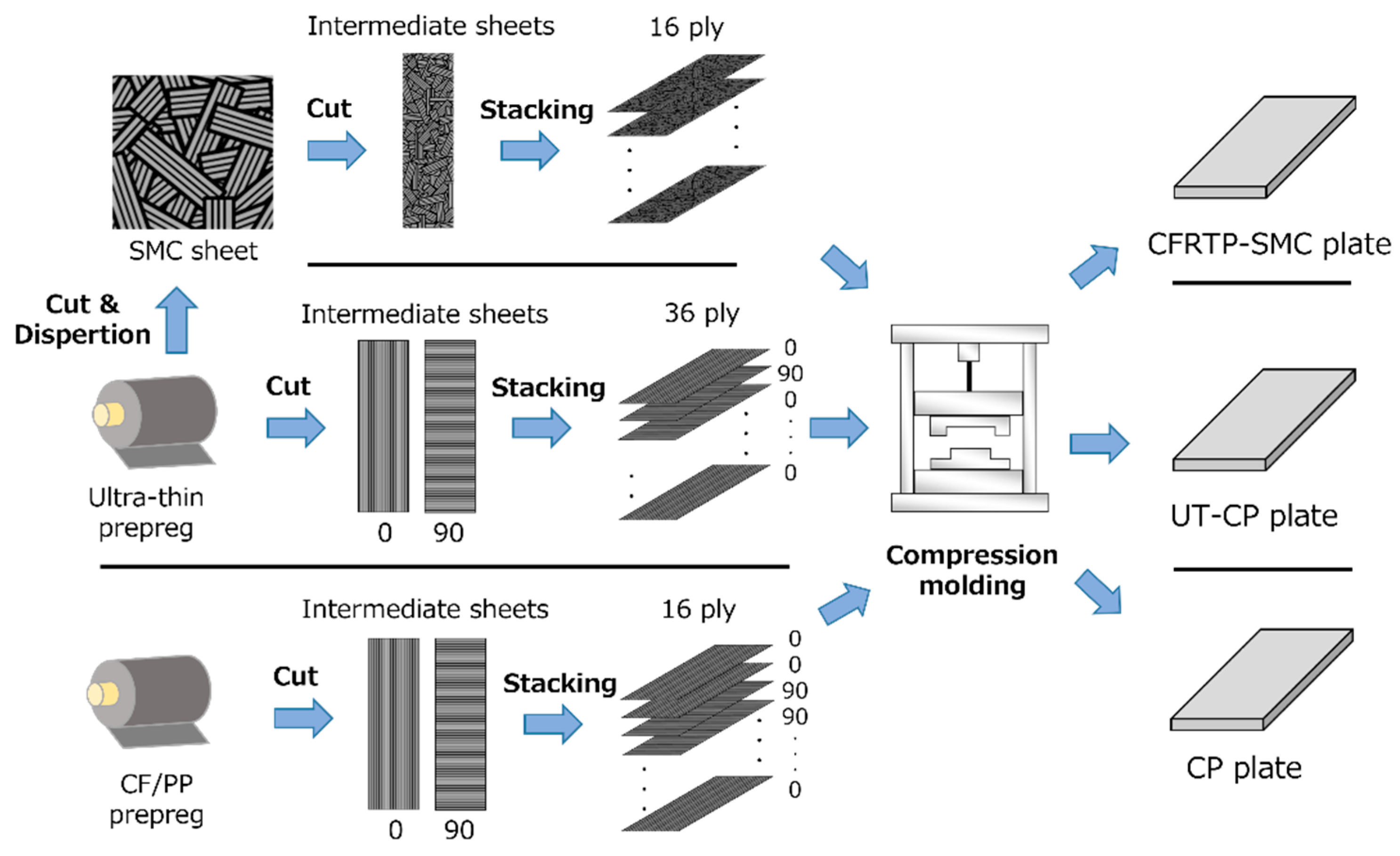 The third material system is conventional cross-ply (CP) material, which is fabricated from CF/PP prepreg sheets, which are composed of TR50S (TR 50S, Mitsubishi Rayon Co., Ltd., Tokyo, Japan) and polypropylene. The manufactured CP plates have a stacking sequence of [02/902]2s and a fiber volume fraction of 45%.