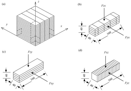 Cutting and loading directions for flexural test: (a) Cutting direction; (b) Prism cut along the x-axis and loaded from z- and y-directions; (c) Prism cut along the y-axis and loaded from z- and x-directions; (d) Prism cut along the z-axis and loaded from x- and y-directions. Reprinted with permission from [64].