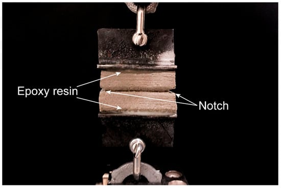 In one study [65], the interlayer bond strength was measured by applying uniaxial tension to printed specimens sized 50 mm × 25 mm × 30 mm. Notches of 5 mm depth were cut into the samples and then put under loading, as shown in Figure 5. To ensure that the specimen failed between the two layers, notches of 5mm depth were cut into the edges of the layer interface. Metal brackets were attached to each side of the sample using epoxy resin. A 1 mm/min displacement was the force applied to calculate the interlayer bond strength, and the failure displacement was noted. It was essential that the sample was aligned in the testing apparatus to ensure that eccentricities remained out of the equation [65].