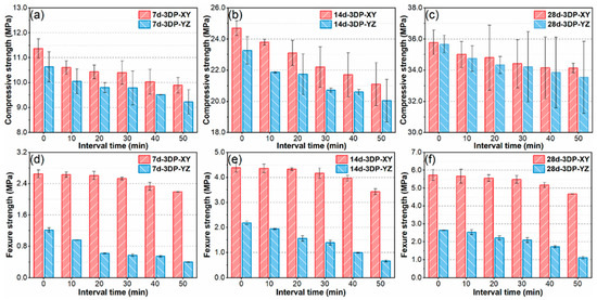 Three-dimensional-printed components are anisotropic, so it is necessary to test them in the x, y, and z directions [63]. In a study [64], the cast specimens were made in a cubic and rectangular prism shape to match the printed samples. Rectangular slabs measuring 1000 mm × 200 mm × 120 mm were printed for compressive strength tests and 500 mm × 200 mm × 180 mm for flexural strength tests. These were then allowed to cure for 28 days, so that full strength could be acquired. Once cured, the printed samples were cut and polished to the dimensions of the moulded samples. The resulting dimensions of the printed cut samples were 70.7 mm × 70.7 mm × 70.7 mm for the compressive test and 40 mm × 40 mm × 160 mm for the flexural test. The 3D-printed samples were loaded in all three directions, and the cast specimen was loaded in one direction, as it was isotropic. The loading direction for the compressive test can be seen in Figure 2, and the cutting and loading direction for the flexural test specimens can be seen in Figure 3. Tests were carried out on days at 1, 3, 7, and 28, to observe how the strength increased over time.