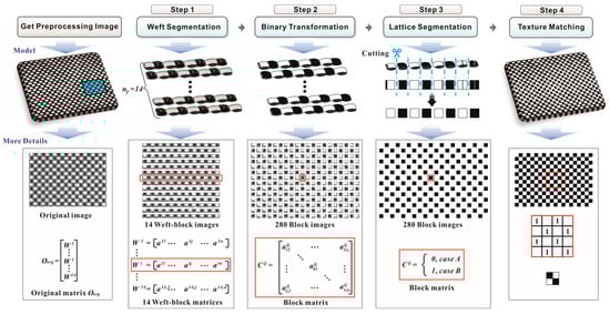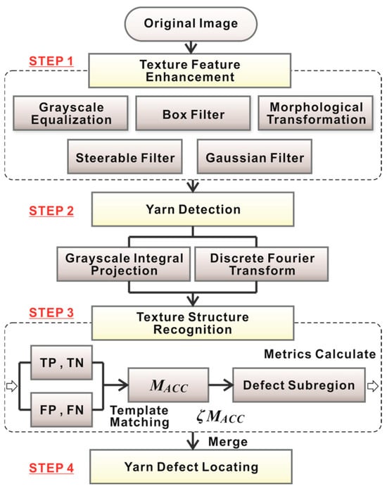 First, five preprocessing algorithms enhance the texture features in the original images. Next, grayscale integral projection and discrete Fourier transform are employed to detect warp and weft yarns, with texture structure identification achieved via the artistic conception drawing (ACD) revert method [37,38]. The ACD revert algorithm generates the matrix Ozo, which serves as the input for calculating the classification metrics. These metrics are compared against templates using predefined rules to derive the ACC matrix, which encapsulates core data for defect recognition, localization, and classification. Defect images are identified by comparing element-wise thresholds in the ACC matrix, while defect localization is achieved through detecting and merging defective sub-regions. The specific implementation process is as follows.
