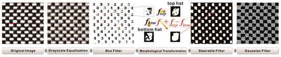 During the image acquisition process, electronic noise, shadows, and light pollution can interfere with image processing [39]. In order to accurately identify the geometric features of the texture structure, warp and weft yarn contours, and warp and weft weave point edges, this paper uses the following preprocessing methods to enhance the texture features. The flowchart is shown in Figure 2.