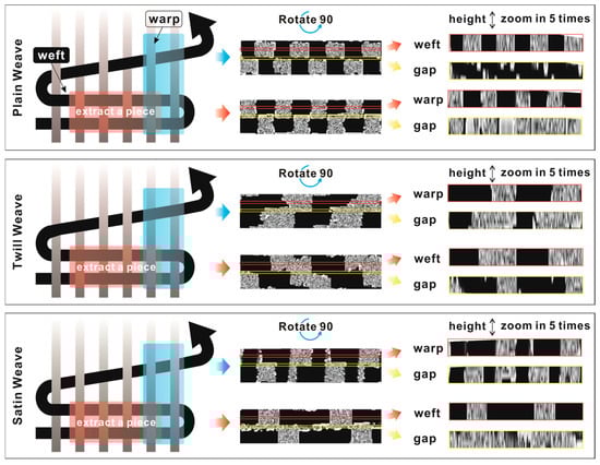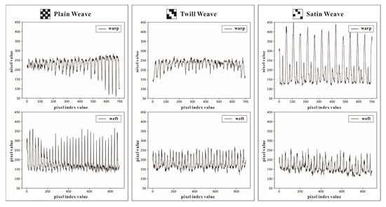 The gray-level integrated projection of all warp (weft) yarns in the images of the three-elementary woven structures.