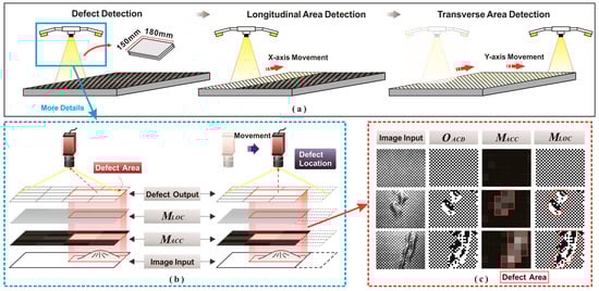 (a) The complete area detection process for surface defects on CFRP components; (b) rapid localization process for the defect center; (c) key images of the defect detection process.