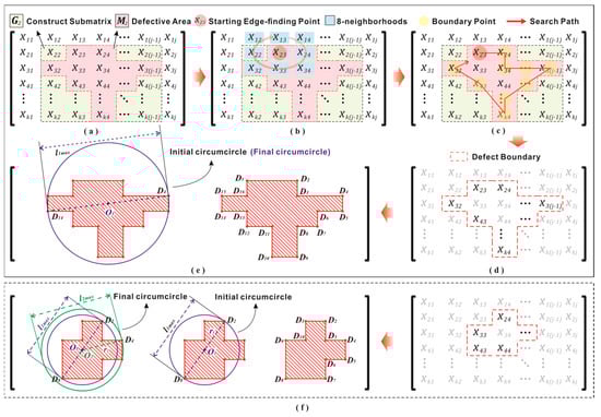 The boundary tracking algorithm for extracting the contours and center of defect areas: (a) construct a submatrix G2 containing the M2 region; (b) find the boundary points in the 8-neighborhood of the starting point; (c) search for all boundary points in sequence; (d) obtain the contours of the defect area; (e) the extraction process for the minimum circumcircle; (f) the process of determining the minimum circumcircle twice is required.