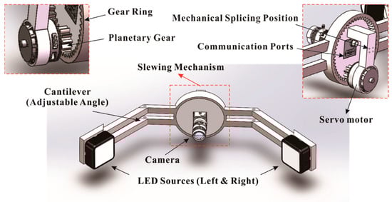The acquisition and processing of high-quality images are essential for extracting surface defects during the preforming process for CFRP components. Nevertheless, several challenges arise in the actual detection process. Firstly, a preforming process workshop typically employs a brightfield light source installed on the roof, leading to an uneven distribution of illumination across the detection target. Additionally, the movement of the wire winding device generates trailing shadows on the surface of the prepreg, resulting in light spots, noise, and impurities that detrimentally impact the imaging quality. Finally, the prepreg is a woven fabric produced by impregnating continuous fibers with a resin matrix under strictly controlled conditions. Each bundle of carbon fiber yarn in the prepreg can contain thousands of fibers. When light strikes the surface of the prepreg, its dense layered structure creates multiple optical reflection layers, leading to overexposure and compromising the quality of image collection. To address the above problems, this study proposes a machine vision detection framework building upon previous research findings [44], as depicted in Figure 7, which leverages visual illumination techniques such as darkfield, low-angle, and linear symmetry lighting [45]. The framework mainly consists of a camera, a servo motor, an LED source, and an angle adjustment and slewing mechanism. An angle-adjustable cantilever driven by a servo unit is used as the main motion structure. It can dynamically switch between darkfield, low-angle, linear symmetric light and multi-angle stereo vision light and can adjust and transform the relative position of the light source in the process of detecting surface defects so that it is convenient to extract the three-dimensional space position of the projection image and the shooting field of view, the pitch angle of the shot, and other parameter information. In addition, the flange at the end of the device can be installed in the end effector of any automatic preforming system, achieving collaborative work between automatic preforming and automatic detection.