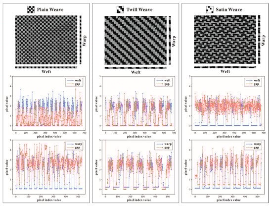 Six types of carbon fabric woven prepreg patterns were collected on site, and Table 2 shows a comparison of the results between the automatic detection algorithm proposed in this paper and the manual detection by professionals. Using the results of manual detection as the experimental truth, it can be seen that the error in the number of warp and weft yarns detected automatically is relatively small. The error rate for the defect-free pattern is less than 1%, and the plain-weave defect-free pattern has the smallest error rate. The error rate for patterns with defects is slightly higher, with the largest being that fir satin-weave (defect) patterns, but this error rate is only 2.12%. This is due to the different stacking stability of different surface structures. When defects occur, structures with poor stability are prone to yarn fluctuations, which can have an impact on automatic detection. But it does not affect the overall detection effect because the detection method in this paper divides the target into blocks for detection, and the yarn parameters of the same prepreg remain unchanged. The detection data for defect-free areas can be extracted to replace the data for defect areas, and these errors are maintained within a small range. The data extraction process for the automatic detection of yarn quantity is illustrated further in Figure 9: grayscale integration projection is performed on individual warp and weft yarns in the three original tissue structure images. This shows that in plain-weave images, the gaps between warp yarns are brighter and have larger grayscale pixel values compared to those for the warp yarn axis, while the gaps between weft yarns are dimmer and have smaller grayscale pixel values compared to those for the weft yarn axis. This rule also applies to twill-weave images, but the warp and weft weave points in twill-weave images present a diagonal structure at a certain angle on the fabric’s surface, so there is a texture of diagonal yarns in the gaps, and the brightness and darkness of the gaps are not as obvious as in plain-weave. The difference lies in the satin pattern images, where the warp yarns of the satin fabrics are denser than the weft yarns, resulting in more pronounced gaps between the weft yarns. The gaps between the warp yarns exhibit a texture of alternating light and dark, and both types of gaps have differences in their grayscale values with their corresponding yarns.