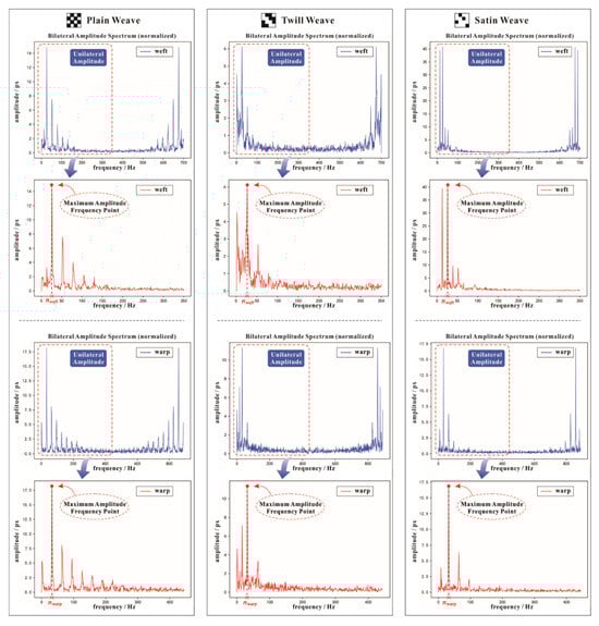 Fast Fourier transform spectrograms of all warp (weft) yarns in the images of the three-elementary woven structures.