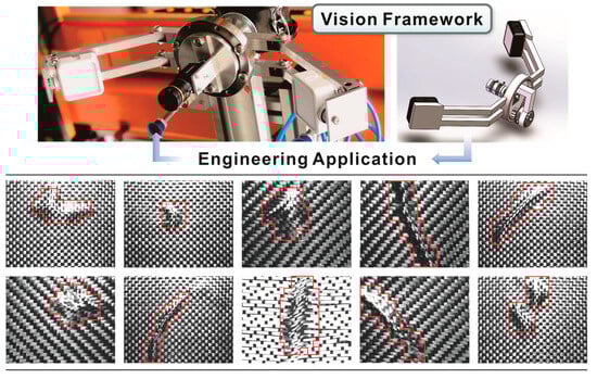 Carbon-fiber-reinforced polymer (CFRP) components serve as critical enablers to achieving structural lightweighting in aerospace, rail transportation, and related industries, where manufacturing quality directly dictates the good service performance of the equipment and operational safety [1,2,3]. During the compression molding process for CFRP components, the key manufacturing stages typically involve the multi-axis layup of core-layer prepreg, orientation-controlled fiber alignment in the reinforcement layers, and thermoset curing under hot-press conditions. Due to the synergistic effects of interlaminar shear stress and thermal gradients during hot-press molding, the outer surfaces of the components are prone to the formation of defects, including delamination, porosity, and fiber misalignment [4]. If left unaddressed, these defects can induce inhomogeneity in the resin flow in subsequent vacuum-assisted resin transfer molding (VARTM) processes, ultimately compromising the cured components’ capacity to meet the prescribed load distribution patterns and fatigue life requirements under operational conditions [5]. In severe cases, such defects may trigger degradations in the global stiffness, substantially diminishing the mass-specific load-bearing efficiency of structural components. Consequently, to mitigate the detrimental impacts of fiber fracture and interlaminar debonding on the structural integrity of large composite assemblies, it is imperative to implement robust online surface yarn (warp and weft) alignment defect detection systems. Such systems enable timely defect remediation and process parameter optimization by manufacturing personnel. Unlike the conventional non-destructive testing, CFRP prepreg inspection resembles a modern form of textile woven fabric analysis, as CFRP prepregs constitute specialized woven structures [6,7]. Due to the interlacing of warp and weft yarns following specific weaving patterns, their surface exhibits a periodic texture defined by the yarn arrangement. The current computer vision methods for identifying surface yarn alignment defects in such materials are classified into image-feature-based [8,9], database-driven [10], and weave-pattern-based approaches [11,12,13,14].