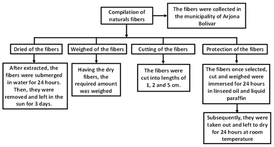 Figure 1 summarizes the methodology for the preparation and conditioning of the fibers. Paraffin wax and linseed oil were used as protective hydrophobic substances, since they do not deteriorate the mortar and are economical.
