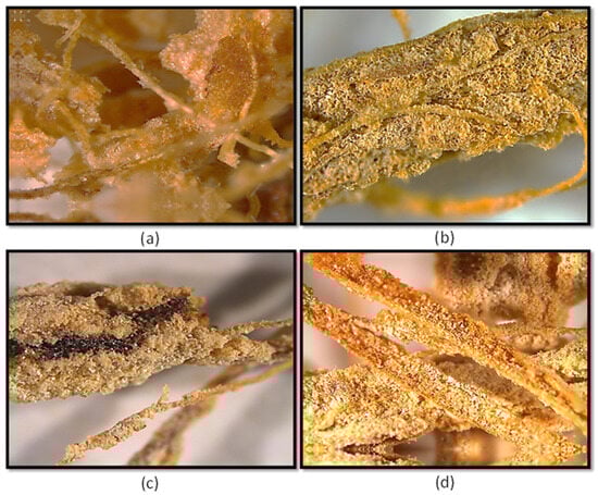 The characterization of the coated fibers was conducted by using the following techniques: (1) Fourier transform infrared spectroscopy (FTIR) in the range of 400–4000 cm−1, (2) thermogravimetric analysis (TGA/DTG) at a constant heating rate of 10 °C/min from 25 °C and 750 °C, and (3) stereomicroscopy at a magnification of 160×.