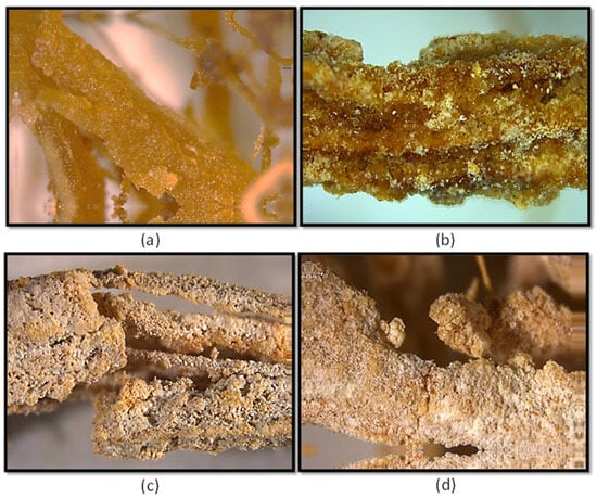 Surface behavior of coconut fiber protected with linseed oil during the immersion process in Ca(OH)2 for (a) 0, (b) 7, (c) 21, and (d) 28 days.