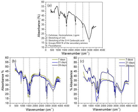 Figure 4c shows the infrared spectra of coconut fiber coated with linseed oil after being immersed in Ca (CO)2 for 7, 21, and 28 days. Peaks 1 to 5 showed similar behaviors to those obtained in the paraffin wax-coated samples (Figure 4b). Marked differences were observed in the peaks below 1000 cm−1 in which the peaks belonged to the stretch of the nitro group CNO2 (889 cm−1), the peak associated with the C-H bond (695 cm−1). After 28 days, peaks associated with the vibrations of the carbonyl groups of hemicellulose with the asymmetric vibrations of methylene and its peaks were observed [18,19,23]. It is worth highlighting that Peaks 1 and 2 did not show significant changes after 7, 21, and 28 days, which would indicate that no degradation occurred.