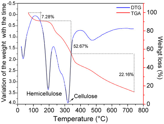 Figure 5 summarizes the thermogravimetric behavior of the coconut fiber before being coated with the hydrophobic substances used in this study. Three important stages of weight loss with increasing temperature were identified. The first stage (25–114.4 °C), which corresponded to the loss of moisture in the sample (7.28%) [25,26]. The second stage (114.4–336.9 °C), which corresponded to the degradation of hemicellulose, cellulose, and part of the lignin [27]; this stage represented 52.67% of the weight loss of the sample and the volatile products generated during decomposition were water, CO, and CO2 [25]. The third stage (336.9–739.7 °C) corresponded to the decomposition of cellulose and the remaining lignin in the coconut fiber [22,28] and represented 22.16% of the weight loss of the sample.