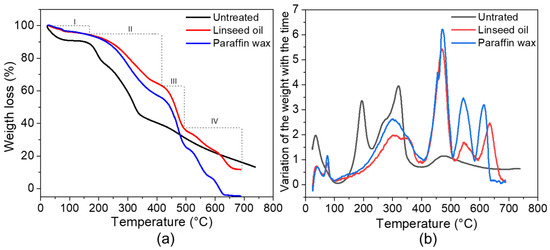 Figure 6 summarizes the thermogravimetric behavior of coconut fiber coated with linseed oil and paraffin wax compared with the unprotected material. The presence of four regions of weight loss can be observed in Figure 6a. The first zone represented the humidity loss of the material (20–167 °C), where 5.5% loss in the linseed oil-coated fiber and 5.7% loss in the paraffin wax-coated fiber were obtained.