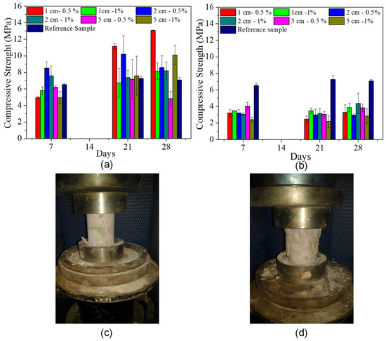 Compression behavior of the fiber-reinforced mortars coated with (a) paraffin wax and (b) linseed oil. Mortar reinforced with 1 cm-0.5 wt.% of coconut fibers coated with (c) paraffin wax and (d) linseed oil subjected to the compression test after 28 days.