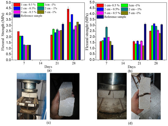 According to the results presented in Figure 8, it was observed that after 28 days of mortar curing, the highest flexural strengths were obtained compared with the reference sample (3.09 MPa) with the addition of 0.5 wt.% of coconut fiber paraffin wax coated reinforcement. The highest values reported were 4.432 MPa (length 1 cm) and 3.968 MPa (length 2 cm). Fiber length is an important variable in the flexural behavior of the material, and the presence of long fibers allows for an alignment toward a specific direction, however, a unidirectional orientation would generate an anisotropic material, which would result in low mechanical properties under loads parallel to the fibers [39] (see Figure 8c,d). Due to this, mortars reinforced with 1 cm fibers in a proportion of 0.5 wt.% (short fibers) were aleatory aligned, showing an isotropic behavior under mechanical stresses. Juarez C. et al. [16] reported increases in the flexural strength of concrete reinforced with 0.5% by volume of lechuguilla fiber; this mechanical strength decreased as the volume of the reinforcing fiber increased. Quintero et al. [38] showed that the addition of coconut fiber improved the flexural strength of concrete when its volume percentage was 0.5% by volume and 5 cm in length. In addition to this, Zou et al. [4] showed that the addition of coconut fibers to a phosphorus and magnesium-based cement significantly improved the flexural strength, reaching 13.49 MPa (15.7% higher than that obtained in the unreinforced material). It is worth noting that the incorporation of coconut fibers to cement-based materials contributes to waste recycling.
