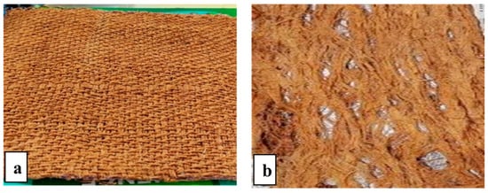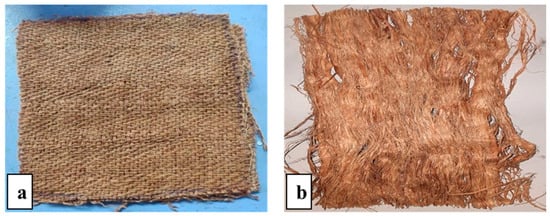 Both acacia and jute fiber undergo a process of cleansing using distilled water. After a 3–4 h drying phase, the fibers were treated with a 5% NaOH solution for 2 h at room temperature. To eliminate residual NaOH, the fibers were then rinsed with distilled water. Finally, the fibers underwent a 24 h drying period at room temperature. A key challenge in natural fiber composites lies in the contrasting properties of the fibers’ water-attracting nature and the water-repelling nature of the matrix. The reinforcement of fibers may undergo chemical treatment to diminish its hydrophilic propensity, thus enhancing its compatibility with the matrix. Nevertheless, such treatment is not consistently effective. A range of physical as well as chemical surface treatment procedures have been documented in prior literature investigations [,]. Treatment with a 5% NaOH solution for two hours significantly enhances the interfacial bonding between jute–acacia fibers and an epoxy matrix, resulting in a cellulosic crystalline structure. This alkaline treatment is key to improving adhesion between the natural fibers and the resin. This enhancement is especially important in applications where composite materials are subjected to varying environmental conditions [,]. The altered surface texture of the jute–acacia fiber, resulting from chemical reactions, facilitated improved mechanical interconnection. The findings revealed that the composite properties were enhanced due to the chemical modification of the fiber. In many cases, non-cellulosic components can interfere with the bonding and interaction of these elements []. These components may include lignin, hemicellulose, waxes, and other extractives that can negatively impact the performance of the composite. Figure 2a,b present the pictures of NaOH-treated jute and acacia fibers, respectively.