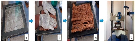 Illustration of Composite preparation. (a) Epoxy resin applied over the mold. (b) Jute fiber laid over the epoxy resin. (c) Acacia fiber laid. (d) Compression molding process.