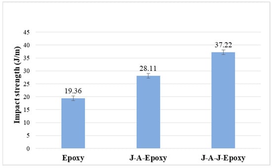 Figure 8 illustrates the energy absorbed for each sample after the impact test. The samples’ impact strength showed similarities with their tensile and flexural strength, with the incorporation of fiber layers augmenting their properties. The figure suggests that the way fibers are stacked significantly enhances the overall impact resistance of the composite material. The specimen J-A-J-Epoxy, having a direct impact absorption of 37.22 J/m, is higher than the specimens Epoxy and J-A-Epoxy in impact absorption efficacy. The specimens Epoxy and J-A-Epoxy exhibit impact strengths of 19.36 J/m and 28.11 J/m, correspondingly. The energy absorption capacity of composites correlates directly with the fiber content and the order of stacking of the material employed. Furthermore, the fibers inside the composites function as a load transmission medium and are capable of inhibiting fracture propagation. The addition of fiber layers to composite materials significantly enhances their impact strength due to the strong interfacial connections between the matrix and the fibers []. This phenomenon can be credited to numerous aspects related to the arrangement and distribution of the fibers within the composite. The quality of the bond between the fiber and the matrix is crucial. A robust interfacial connection ensures effective stress transfer during impact, leading to improved energy absorption and distribution throughout the material [,].