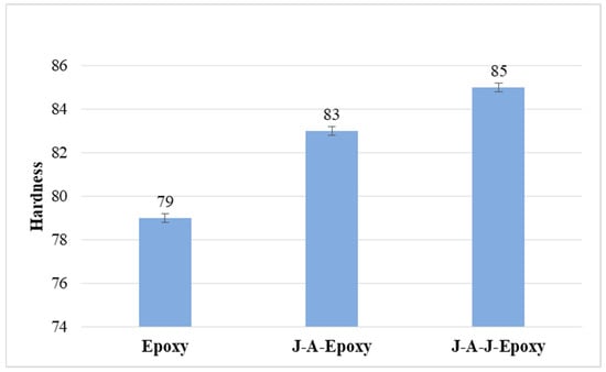 - The hardness of the specimen J-A-J-Epoxy exceeds the value of the specimens Epoxy and J-A-Epoxy. The increased quantity of fiber layers and layering sequence points to a rise in the hardness of the sample J-A-J-Epoxy. SEM images indicate the absence of significant voids in the specimen J-A-J-Epoxy in contrast to the specimen J-A-Epoxy.