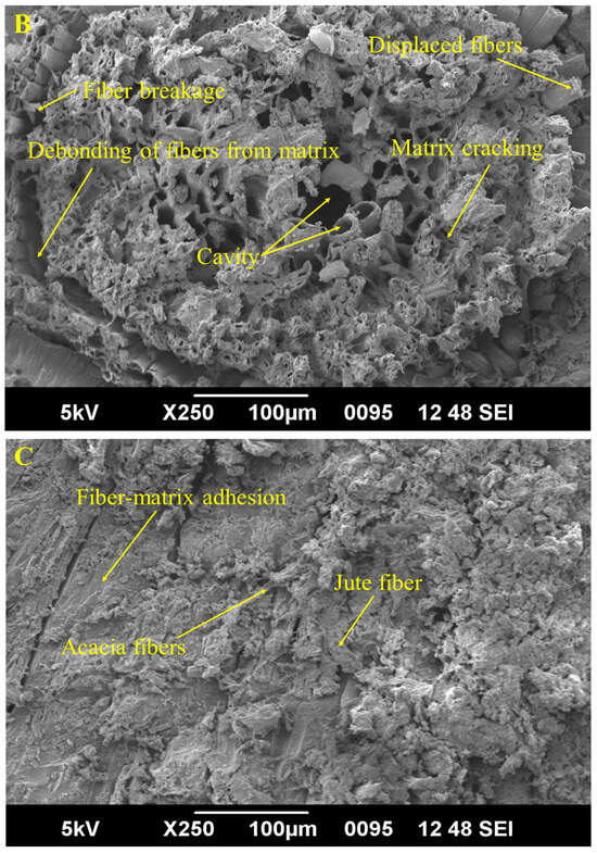 The void fraction impacts the composite’s mechanical, thermal, and durability. Voids concentrate stress and cause cracks, reducing matrix-dominated interlaminar shear, flexural, compressive, and tensile strength. Voids weaken composite fatigue and durability. For optimal mechanical strength, thermal characteristics, and durability, the manufacturing of the composites required void fraction reductions. Mechanical and morphological data demonstrate that J-A-J-Epoxy has a lower void % than the other specimens. Consequently, the mechanical characteristic analysis of the specimen J-A-Epoxy composites yielded poor results. Figure 10B illustrates the damage mechanisms observed in the fractured composite matrix, including fiber pull-out, broken fibers, and cracks within the matrix itself. Additionally, the image reveals fiber de-bonding and the presence of fiber splitting and matrix debris at the fiber–matrix interface. Evidence of matrix detritus was present on the fiber surfaces, indicating that matrix material had separated from the fibers in the failure phase. Figure 10C effectively illustrates the enhanced bonding that exists among the jute–acacia fibers and the epoxy matrix, as well as the fractured fibers resulting from tensile stress. Despite minimal fiber delamination, the sample exhibited superior fiber-to-matrix adherence. The mechanical properties of epoxy are enhanced when it has a stronger bond among the jute–acacia fibers with epoxy. Cracks within the matrix signify brittle failure, which is the primary mechanism of failure []. Even so, significant fractures are absent in the specimen J-A-J-Epoxy because of excellent fiber–matrix adhesion. Conversely, significant fractures are improbable in this region because of the excellent fiber–matrix adhesion. Due to the existence of fiber sandwich structures and the lack of significant cavities and cracks, the specimen J-A-J-Epoxy demonstrates enhanced bonding relative to the specimen J-A-Epoxy composite. Because of the amount of fibers in the inner layers, which take up more load before breaking and undergo greater amounts of bending, Figure 10C indicates that the existence of fibers results in jute–acacia–epoxy bonding and a reduced degree of matrix fracture []. This is because the fibers absorb more weight before breaking. The sandwich structure led to a reduction in the percentage of broken fibers and fiber breakage, which significantly influenced the flexibility and tensile strength []. The tensile and flexural characteristics of hybrid composites have been examined, revealing that sandwich composites exhibited the most optimal results, demonstrating substantial tensile and flexural strengths. According to the investigation, the specimen J-A-J-Epoxy exhibits low voids and favorable fiber–resin adhesion properties. It has been shown, therefore, that multidimensional composites are stronger when compared to their mono-layered counterparts []. The SEM details indicated that Figure 10C demonstrated superior interfacial interactions. A more even fiber distribution and lessened clumping result from this process. The enhanced tensile strength may be attributed to the consistent dispersion of jute–acacia throughout the matrix. The inclusion of layers enhances the connection between the fibers and that helps to prevent the formation of micro-voids. Moreover, an increase in the layers enhances reinforced stiffness and uniformly increases load distribution. The mechanical, physical, and durability qualities of natural fiber-reinforced epoxy composites depend on their chemical affinity. The effectiveness of natural fiber-reinforced epoxy composites depends on it. The chemical and physical processes of fibers strengthen interfacial bonding, improving mechanical characteristics, durability, and environmental resistance. Thus, developing sustainable, high-performance bio-composites requires optimizing fiber–matrix chemical compatibility. Mechanisms of interfacial bonding include mechanical, chemical, and physical interactions. Fiber surface roughness allows matrix–fiber physical interlocking. Covalent or hydrogen bonding between fiber surface functional groups and the epoxy matrix improve adhesion. Van der Waals and electrostatic forces contribute but are weaker than chemical bonds. The impact on composite features includes stress transfer, moisture resistance, and durability. Strong chemical affinity improves the tensile, flexural, and impact strengths by efficiently transferring load from the matrix to the fibers. Water infiltration can impair the interface and mechanical qualities, but good chemical bonding prevents it. Improved interfacial adhesion resists fracture development, delamination, and environmental degradation.