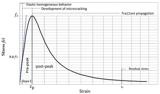 The strength () and the stress–strain relationship (, ) of unconfined concrete under uniaxial compression are the most used properties for the design and analysis of reinforced concrete structural elements [10,11,12] In engineering, knowledge of the complete stress–strain relationship is required to determine, for example, the deflection, ductility, and prestressing loss of members resisting compressive stress, such as reinforced or prestressed concrete beams, columns, foundations and arches [13]. The stress–strain response of concrete is also a fundamental property for modeling and simulating concrete structure behavior as well as for design purposes.