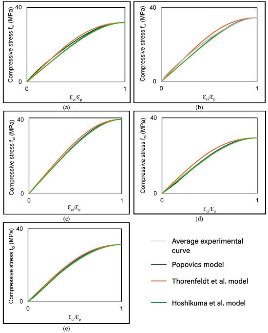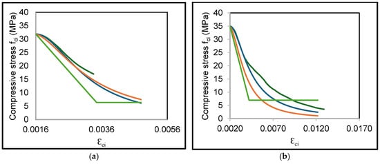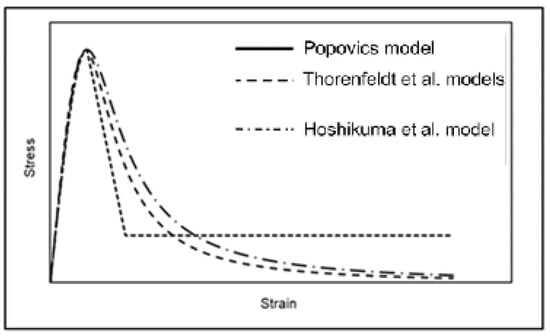 Several models have been developed to predict the stress–strain response of concrete under uniaxial loading. For example, Popovics [16] used normal strength concrete (20 ≤ ≤ 60) to determine pre-peak and post-peak stress–strain response and used Equation (1) with the values A = 0, k = 1, and n as