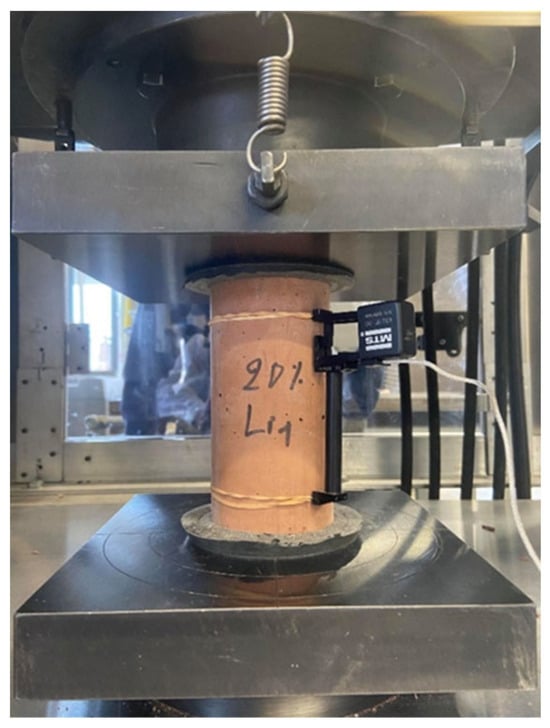 Concrete cylinders comprising different concrete mixes the authors cast and underwent a moist cure for a period varying from 7 to 180 days before being tested under uniaxial compression according to CSA A23.2 [34]. For each concrete mix, cylindric samples (diameter of 76.2 mm × height of 152.4 mm) the authors loaded by two methods. A first sample was preloaded at 0.8 kN and then loaded at a rate of 1.14 kN/s (force controlled) up to failure, as described in CSA A23.2 [34]. From these first tests, the authors determined that a displacement rate of about 0.01 mm/s was the best match for a pre-peak loading rate of 1.14 kN/s, as specified by CSA A23.2 [34]. The other samples of the tested concrete mix the authors then preloaded at 0.8 kN and loaded at this displacement rate of 0.01 mm/s (displacement controlled) to adequately monitor the pre- and post-peak stress–strain response. Figure 3 presents the testing apparatus and the deformation data acquisition system.