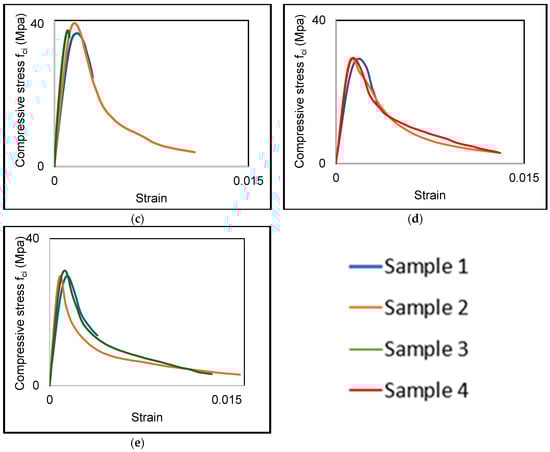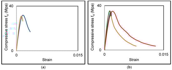 Figure 4 compares the stress–strain response for specimens of the same mix, and Figure 5 compares the response of all mixes in terms of stress versus normalized strain (/). This normalization simplifies the comparison of the different types of mixes and failure according to the compressive strength. Generally, introducing BR does not appear to modify the shape of the curve established with conventional concretes. Figure 5 and Figure 6 show that the stress–strain curves differ very little in the pre-peak phase, although the same concrete formulation and the cylinders underwent the same treatment conditions. Adding BR has very little effect on the pre-peak phase.