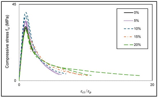 In this equation, the parameter K is a function of the slope of the descending branch, whereas parameter A represents the residual resistance in compression in proportion to the resistance at the peak. Typically, the value of parameter A is about 10% to 20% for portland cement concrete [44]. For the tested compounds, a residual strength corresponding to approximately 10% of peak strength was obtained for large deformations, regardless of the amount of BR. For the tested concrete mixes, this study therefore proposes A = 0.10 as a value to be applied.