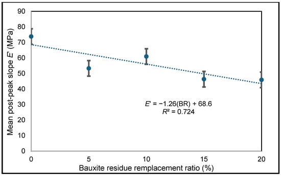 This study determined the fracture energy (area under the post-peak curve) by comparing the strain measured at the peak and a strain of 10% of the maximum stress, presented in Figure 8 as a function of the BR replacement ratio. Fracture energy increases and the slope of the post-peak response decreases as BR content increases. This study observes a quasi-linear relationship between the post-peak slope and the BR replacement ratio, with a coefficient of determination defined by the relationship (Equation (10)), where the bauxite residue replacement ratio expressed in % (Figure 9). This relationship holds for the entire range of experimental BR replacement ratios. A limit lower than E′ was therefore set at 35 Mpa.