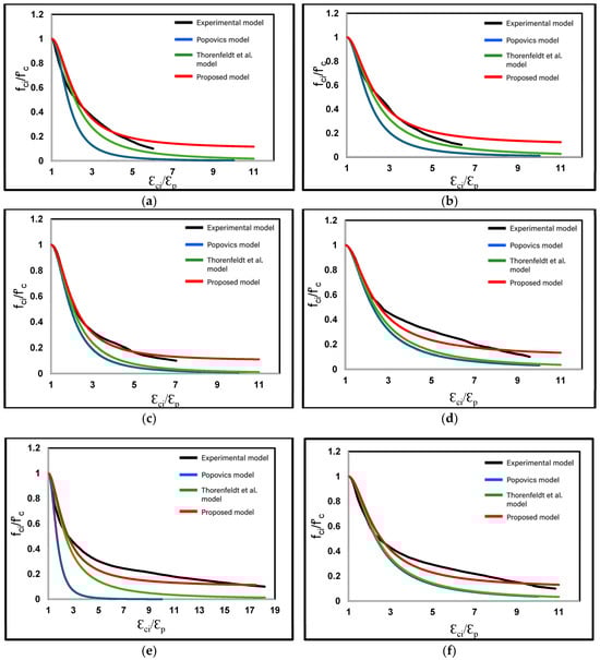 To better understand the trend of Equation (14), the authors plotted stress–strain curves for the BRC mixtures and the control concrete. Figure 11 represents the compatibility of the experimental data of the post-peak part of the stress–strain curves with the authors’ model and the existing models in the literature. Our proposed model and its parameters A and K are in better agreement with the experimental results than those of Popovics and Thorenfeldt et al. [16,36].