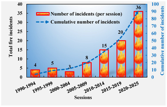 Cladding panels are one of the most important protective envelopes in high-rise buildings. The main purposes of this cladding system are to protect the building from wind damage and wet weather conditions and to provide thermal comfort inside the building [1,2]. Combustible composite cladding panels, i.e., aluminium composite panels (ACPs), are commonly used due to their lower cost, lightweight properties, improved energy efficiency, and readily available polymeric core materials [3]. As the construction of high-rise buildings has expanded persistently in recent decades, the application of combustible ACP panels has also increased noticeably [4]. However, several fire incidents have occurred in different countries. Since 2010, the number has been increasing rapidly (Figure 1). Recent fire incidents such as the Lacrosse Building fire in Melbourne in 2014 [5], the Grenfell Tower fire in 2017 [6], the Dwelling Building in South Korea in 2017 [7], the Milan tower block in Italy in 2021 [8], and the apartment building in Dubai in 2023 [9], involved combustible ACP cladding panels. The polymeric core materials of the combustible cladding panels are highly flammable, which is considered the main reason for fire spreading [10]. Most of the current combustible cladding panels contain highly flammable polymeric core materials such as polyethylene (PE), polyurethane (PU), polyisocyanurate (PIR), extruded polystyrene (XPS), and expanded polystyrene (EPS) [6,11,12]. The use of combustible cladding systems has been restricted in high-rise buildings by different authorities [10,13,14,15]. Building-safety authorities worldwide are now changing the requirements for applying cladding panels in high-rise buildings [16]. Consequently, building construction authorities now mandate using non-combustible cladding for high-rise buildings [10]. In Australia, the National Construction Code (NCC) has tightened the use of combustible cladding panels in buildings [17]. The update performed in 2019 and 2022 to volume 1, Section C, reflects the restrictions on the combustible cores in ACPs in building classes 2 to 9. In New South Wales and Victoria, the states have already implemented the ban on ACPs with more than 30% PE core [18]. In the UK, noticeable changes have also occurred. UK building regulations (2018) banned the use of ACPs containing a PE core in the external wall of buildings taller than 18 m [19]. They also enforced a requirement for buildings taller than 18 m to use materials in the external wall to achieve Euroclass A2-s1, d0. The BS 8414 standard [19] has also been updated by testing the whole cladding system instead of individual components. In the USA, the International Building Code (IBC) has also been updated due to the recent fire incidents; IBC section 1403 and chapter 26 (plastics) have been modified, which control the use of cladding materials [20]. In Europe, regulatory changes have also taken place. In high-rise buildings now, Class A2 or better ACPs need to be used. The testing following EN 13501-1 [21] has also been stringent for the reaction-to-fire classification of the materials.