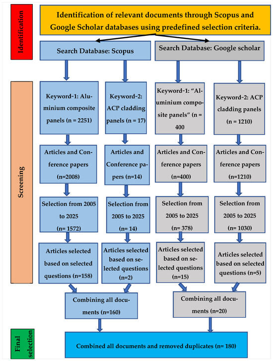The methodology used in this research for selecting and processing articles is depicted in Figure 2. Four screening stages are employed for the selection and processing of research articles from the Scopus and Google scholar databases. In the initial stage, two primary keywords (keyword 1—“aluminium composite panels”; keyword 2—“ACP cladding panels”) are utilised to gather all relevant published documents. The first screening takes place to narrow down the specific document types for each topic and to pinpoint the relevant documents. A second screening is performed using the time range from 2005 to 2025 to select the last two decades of documents. The final screening occurs in the next stage, focusing on specific questions to sort out the relevant documents. The questions are as follows: