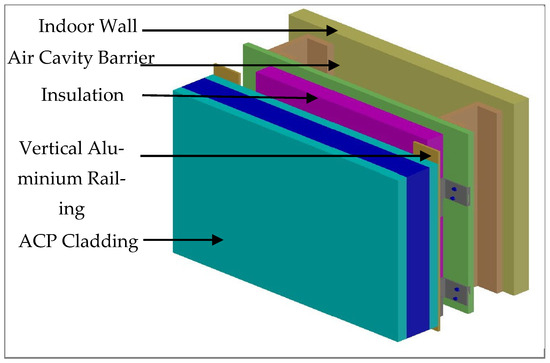 A cladding system is a combination of different parts used to form the outer covering of a building (Figure 4). It includes cladding panels, insulation, moisture barriers, ventilation systems, and any necessary structures or supports for attaching them to the building [15]. The cladding system has a dual purpose: it provides functional benefits by shielding the building from environmental elements and enhancing its overall design and visual appeal [34]. For this purpose, the cladding materials must be novel, thermally resistant, and environmentally friendly [35,36]. Many researchers believe that fire accidents and fatalities have increased due to the recent incorporation of flammable materials into aluminium composite cladding panels and their wide application [16,37]. Non-combustible (NC) cladding panels play a vital role in reducing the aftermath of fire incidents [34]. Therefore, further research on non-combustible cladding panels is required to provide fire-risk-free cladding systems for high-rise buildings.