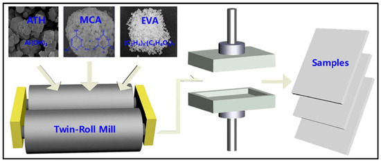 Kalali et al. [106] developed an innovative flame-retardant system for wood polymer composites (WPCs) using a combination of APP and phytic acid-modified layered double hydroxides (Ph-LDH) as raw materials. The inclusion of Ph-LDH resulted in the early degradation of WPCs, leading to more thermally stable products and improved carbon formation. The combustion performance of the WPCs was assessed using LOI, UL-94, and cone calorimetry. The study demonstrated that the addition of Ph-LDH had a synergistic effect on the combustion performance of WPCs, thus making them suitable for applications in buildings or furniture requiring high flame resistance. In another study, Xu et al. [107] addressed the high flammability issue associated with ethylene vinyl acetate (EVA), a commonly used material. They developed highly flame-retardant EVA composites through a combination of melt blending and template methods (as depicted in Figure 6). The combustion tests revealed that EVA-60-40, consisting of 60 wt.% ATH and 40 wt.% monochloroacetic acid (MCA) formed the most effective thermal insulation layer, enhancing its flame resistance. Furthermore, EVA-60-40 exhibited the highest LOI value of 27.5% and attained the UL-94 V-0 grade, indicating its non-flammability. These findings demonstrated that the synergistic effect of ATH and MCA had significant benefits, making the EVA-ATH-MCA composite widely applicable in the construction industry.